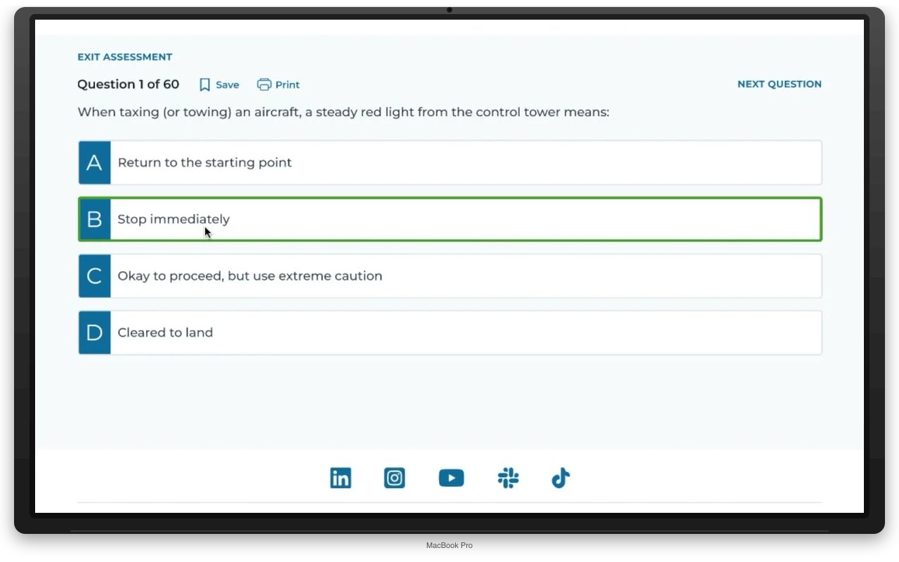FAA-aligned quizzes, oral, and practical assessments with AI-assisted grading and feedback loops.